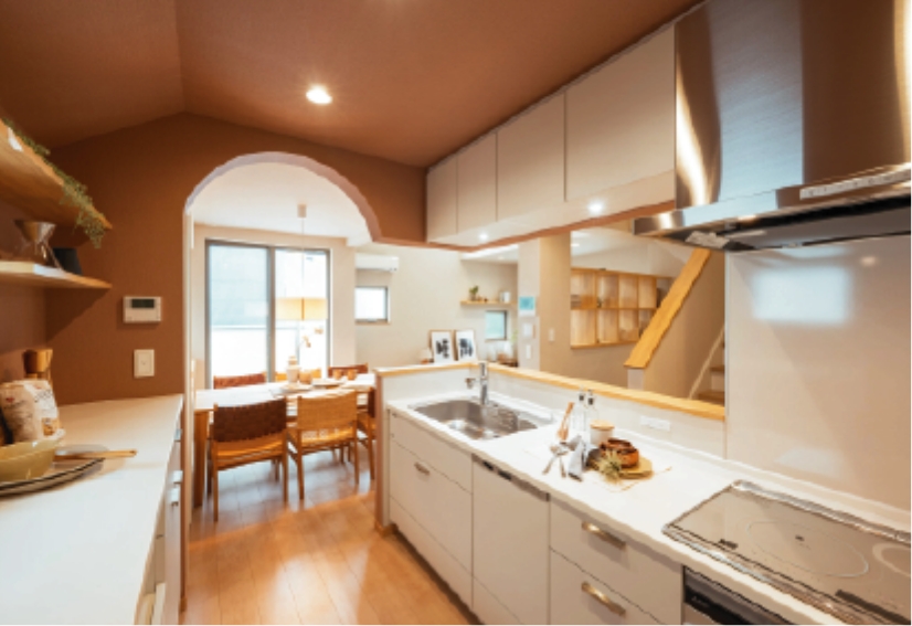 アーチやレンガ調タイルを設え、