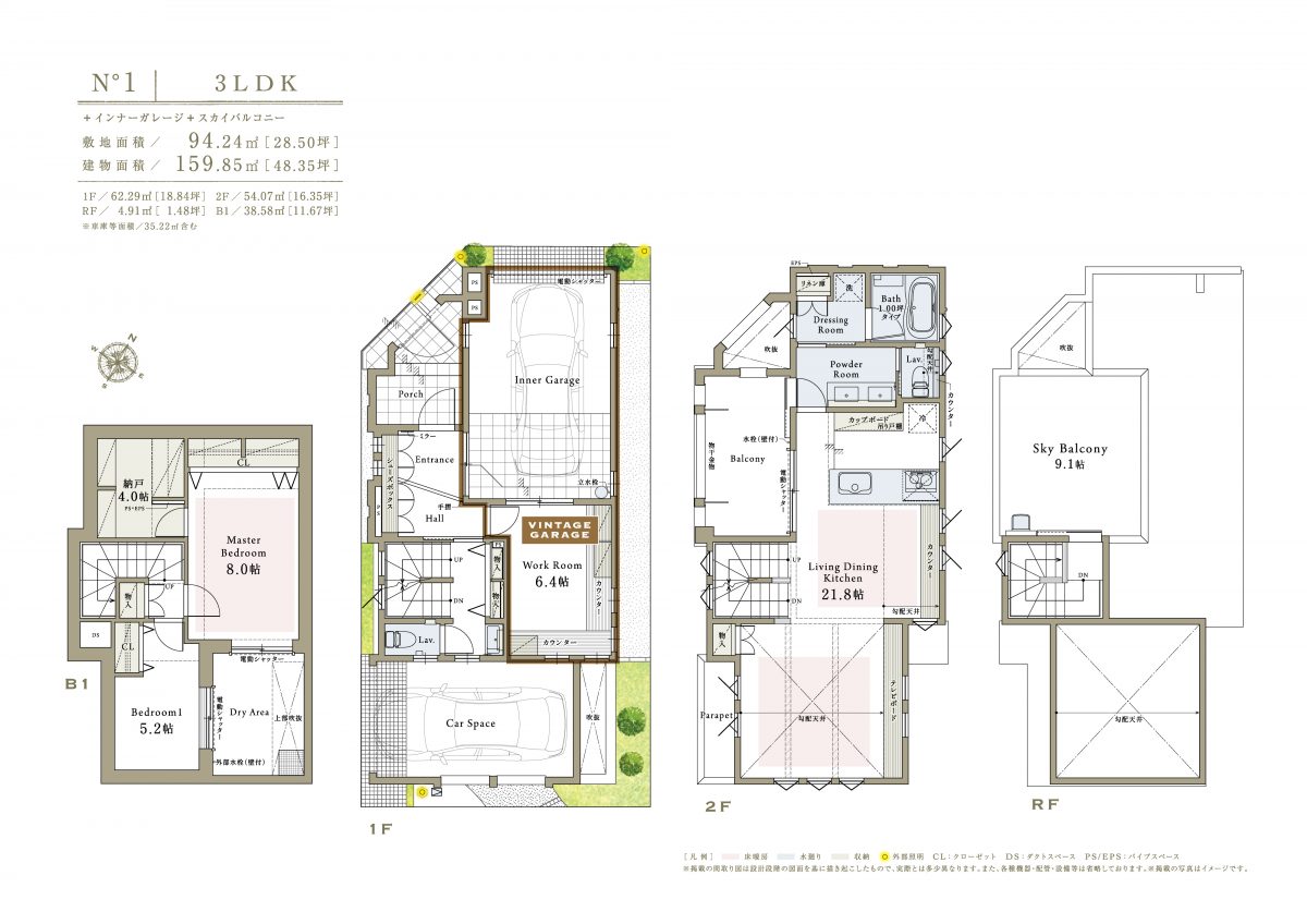 No.1:3LDK 敷地面積:94.24㎡(28.50坪) 建物面積:159.85㎡(48.35坪)